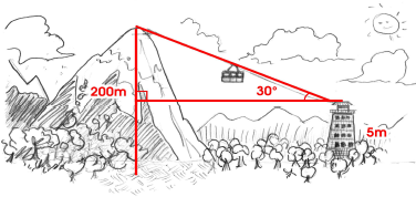 (Cotil 2019) O prefeito de uma cidade turística pretende construir um teleférico unindo o parque cultural ao topo de uma montanha de 200 m de altura, como mostra a figura abaixo. Considerando que a plataforma de embarque do teleférico deve estar a uma altura de 5 m do chão e que o pico da montanha possa ser observado sob um ângulo de 30° determine a distância percorrida pelo teleférico do ponto de embarque ao topo da montanha.