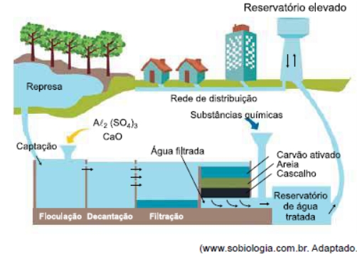 Na Estação de Tratamento de Água (ETA), diferentes substâncias químicas são adicionadas à água nos diversos tanques por onde ela passa. No tanque de floculação, por exemplo, a adição de certas substâncias químicas estimula a formação de um composto gelatinoso, o hidróxido de alumínio, que provoca a aglutinação das partículas de sujeira. Essas partículas aderem ao composto gelatinoso, formando flóculos sólidos de tamanho maior, que são facilmente sedimentáveis.